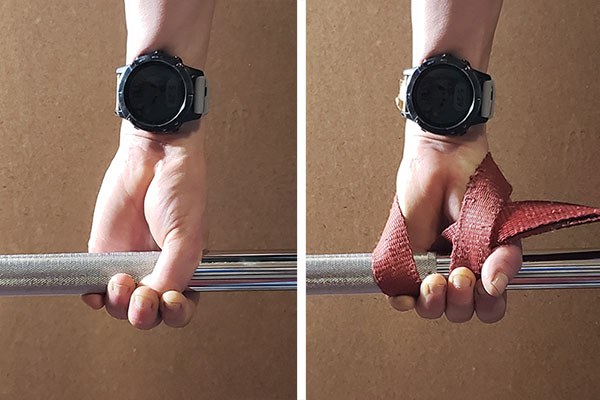 Left, holding the bar with a hook grip where the thumb is used as a strap. Right, gripping the bar with a strap made from a salvaged come-along.