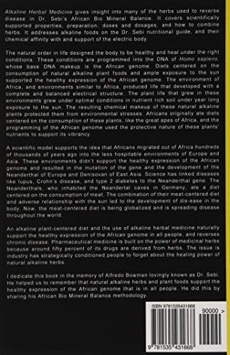 Alkaline Herbal Medicine gives insight into many of the herbs used to reverse disease in Dr. Sebi’s African Bio Mineral Balance. It covers scientifically supported properties, preparation, doses and dosages, and how to combine herbs. It addresses alkaline foods on the Dr. Sebi nutritional guide, and their chemical affinity with and support of the electric body.The natural order in life designed the body to be healthy and heal under the right conditions. These conditions are programmed into the DNA of Homo sapiens, whose base DNA makeup is the African genome. Diets centered on the consumption of natural alkaline plant foods and ample exposure to the sun supported the healthy expression of the African genome. The environment of Africa, and environments similar to Africa, produced life that developed with a complete and balanced electrical structure. The plant life that grew in these environments grew under optimal conditions in nutrient rich soil under year long exposure to the sun. The resulting chemical makeup of these natural alkaline plants protected them from environmental stresses. Africans originally ate diets centered on the consumption of these plants, like the great apes of Africa, and the programming of the African genome used the protective nature of these plants’ nutrients to support its vibrancy.A scientific model supports the idea that Africans migrated out of Africa hundreds of thousands of years ago into the less hospitable environments of Europe and Asia. These environments didn’t support the healthy expression of the African genome and resulted in the mutation of the gene and the development of the Neanderthal of Europe and Denisovan of East Asia. Science has linked diseases like lupus, Crohn’s disease, and type 2 diabetes to the Neanderthal gene. The Neanderthals, who inhabited the Neandertal caves in Germany, ate a diet centered on the consumption of meat. The combination of their meat-centered diet and adverse relationship with the sun led to the development of dis-ease in the body. Now, the meat-centered diet is being globalized and is spreading disease throughout the world. An alkaline plant-centered diet and the use of alkaline herbal medicine naturally support the healthy expression of the African genome in all people, and reverses chronic disease. Pharmaceutical medicine is built on the power of medicinal herbs because around fifty percent of its drugs are derived from herbs. The issue is industry has strategically conditioned people to forget about the healing power of natural alkaline herbs.I dedicate this book in the memory of Alfredo Bowman lovingly known as Dr. Sebi. He helped us to remember that natural alkaline herbs and plant foods support the healthy expression of the African genome that is in all people. He did this by sharing his African Bio Mineral Balance methodology.Categories: herbal remedies, naturopathy, healing, herbs, herbal medicine