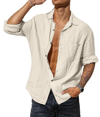 Mens Casual Cotton Linen Button Down Shirts Dress Shirt Vintage Shirts with Pocket