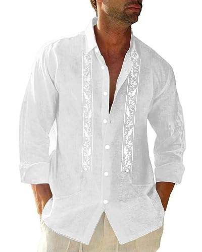 Mens Cotton Beach Shirts For Occasions: Mens long sleeve button down shirts look very handsome overall, embroidery style, two vertical geometric stripes, two chest pockets, turn-down collar, and button-down closure, which are perfect for wedding, beach, party, office, casaul, date and daily wear.