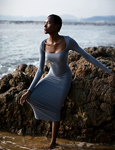 PUMIEY Women’s Square Neck Long Sleeve Maxi Dress Ribbed Bodycon Dresses for Women Soft Lounge Dress