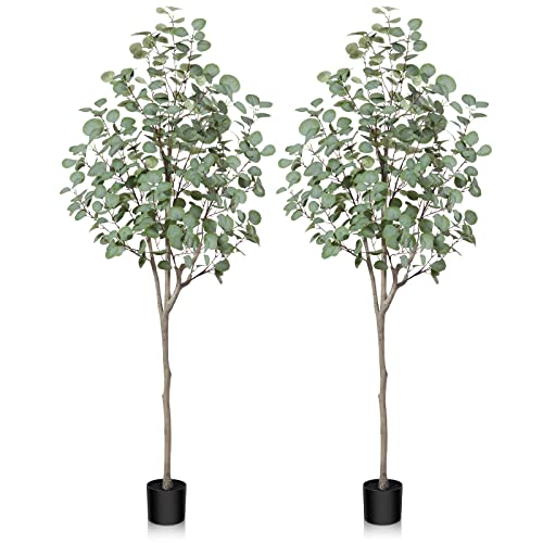 Specification: SOGUYI 6ft Artificial Eucalyptus Tree, Fake Eucalyptus Tree with Green Silver Dollar Leaves, Silk Faux Eucalyptus Tree with Plastic Nursery Pot, Artificial Plants for Home Office Indoor Decor,2 Pack