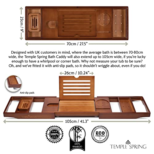 Temple Spring Bathtub Caddy Tray – Extendable Bath Tray for Bathtub with Candle, Wine Glass, Book, iPad & Phone Holders – Adjustable Bathtub Tray Over tub w/Bathroom Accessories – Wood Brown
