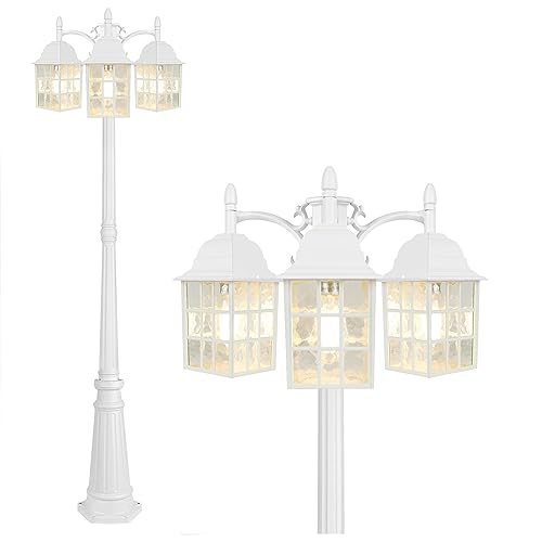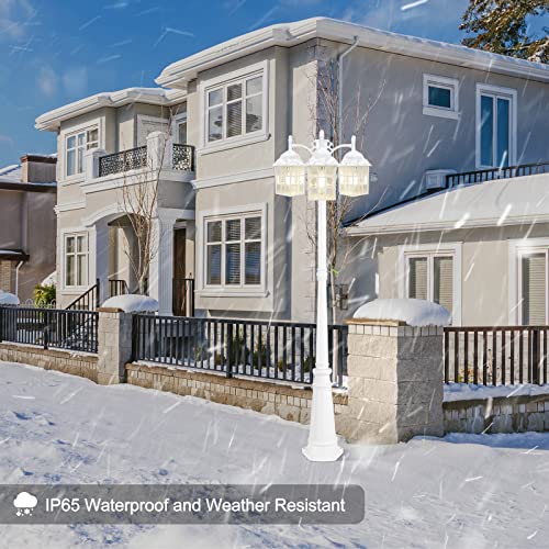 Specification: 3-Head Lamp Post Outdoor Lighting, Dusk to Dawn Sensor Post Lights for House, Street Light with Water Ripple Glass Shade, E26 Base White Light Fixtures, Lantern Lamp for Driveway, Backyard, Garden