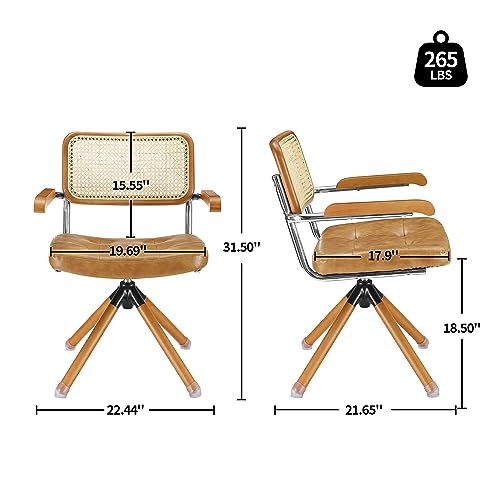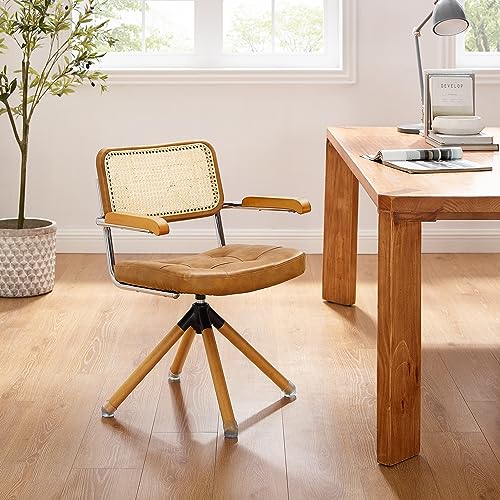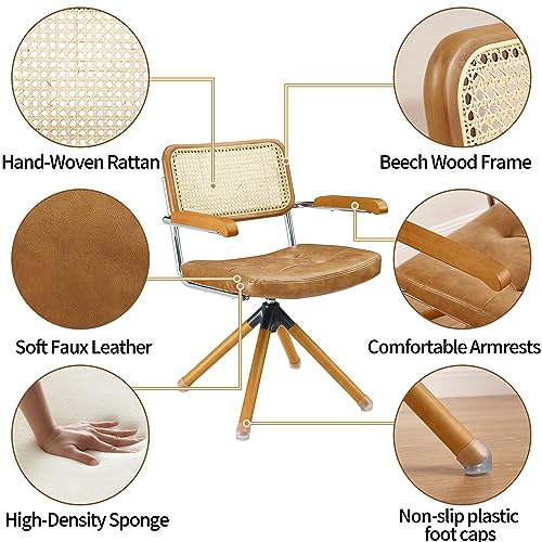Specification: Art Leon Rattan Desk Chair, Mid Century Modern Swivel Accent Chair No Wheels, Faux Leather Office Chair with Wood Legs, Armchair with Rattan Back for Home Office Living Room Bedroom, Brown