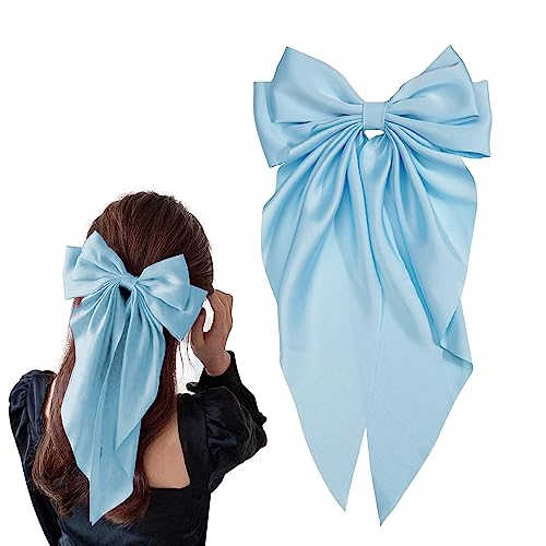 Specification: Jumbo Bow Clip with Tails Hair Bow Clip For Woman Girls Silky Satin Hair Barrettes Clip Large Bow Hair Slides Metal Clips French Barrette Long Tail Bowknot Hairpin Hair Pins Accessories (Light Blue)