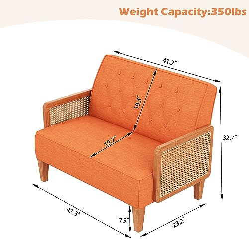 POINTANT Love Seat Settee Mini Couch Upholstered Sofa with Natural Rattan Armrest Backrest Button Tufted Buckle Couch Banquette Bench Loveseat for Dining Living Room Bedroom Orange