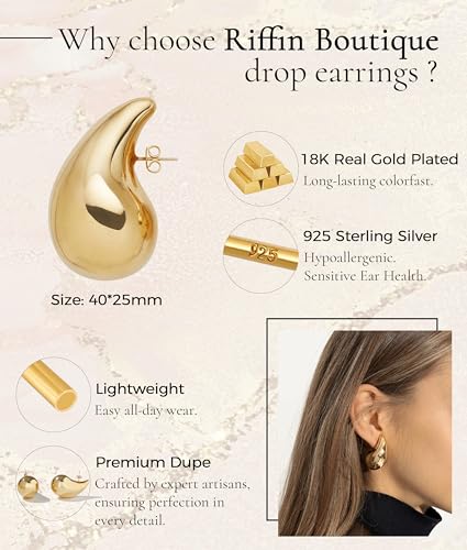 Specification: RIFFIN Chunky Gold Hoop Earrings 14K Real Gold Plated Sterling Silver Hypoallergenic Statement Tear Drop Dangle Earrings Designer Dupes for Women Girls Trendy Fashion Jewelry, Large