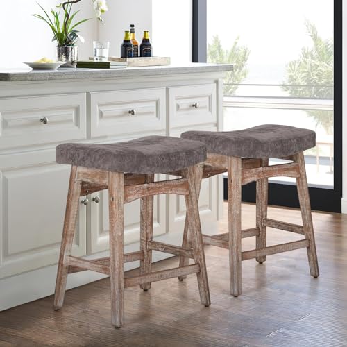 Specification: Sophia & William Counter Height Bar Stools Set of 2, Kitchen Island Saddle Stools with Sturdy Wooden Legs, 24″ Vintage Lacquered Feet Linen Seat Bar Stools,Upholstered Counter Stools,Grey