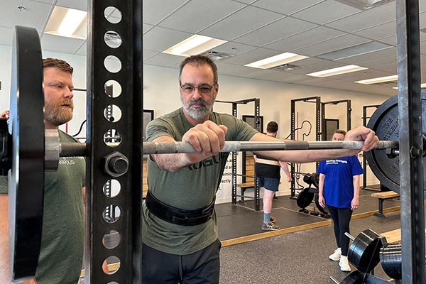 Will Morris coaches a lifter through the squat at the recent training camp held in Phoenix, AZ. [photo courtesy of Dan Ballinger]