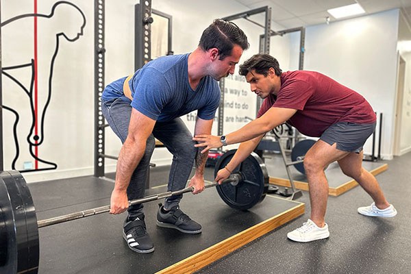 73-year-old Greg, from Eagle, Idaho, getting his start position adjusted during his last set of deadlifts at the training camp in Boise. [photo courtesy of Sam Krapf]